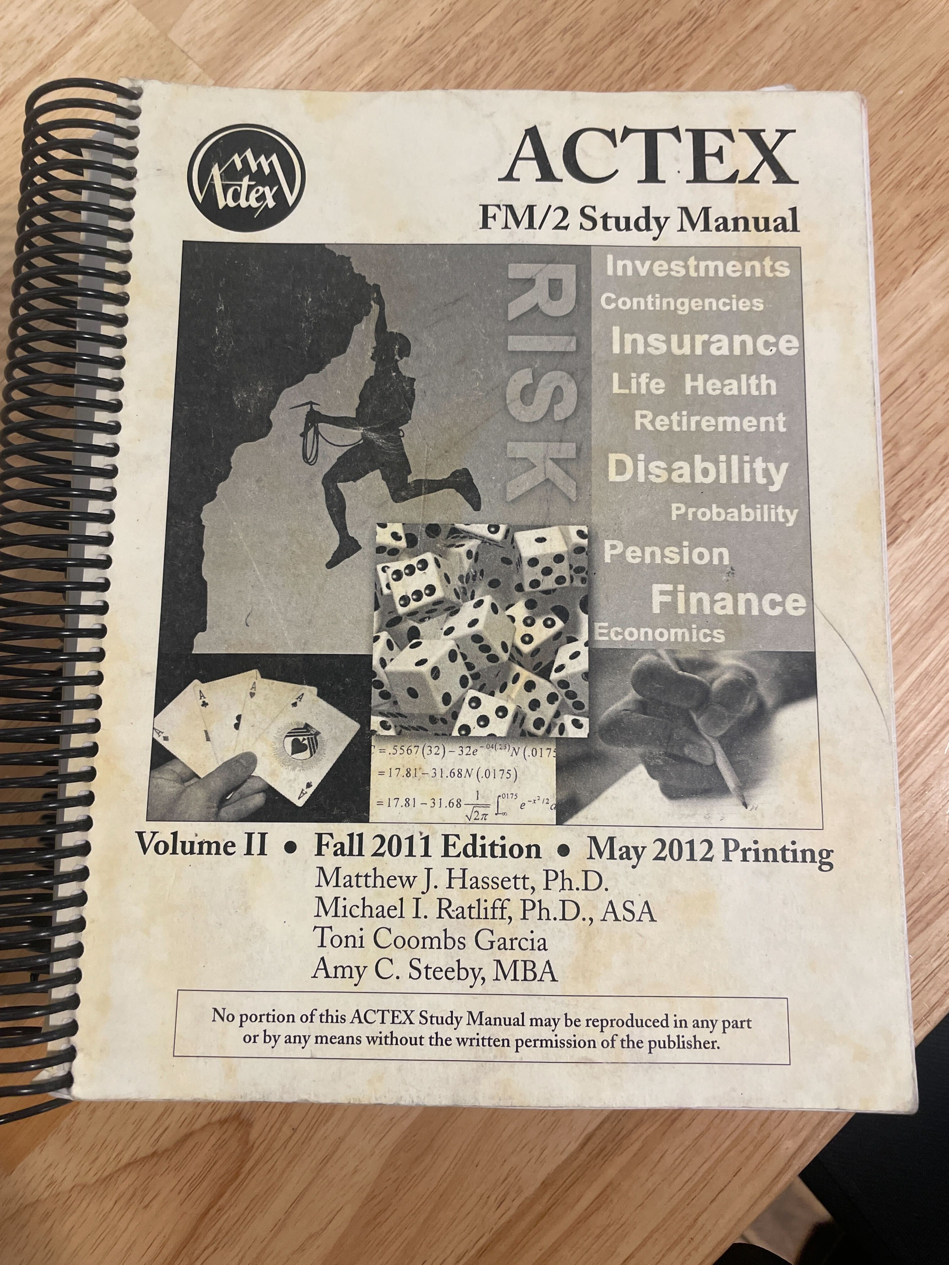At least hypothetically, the math actuaries are exposed to and must know to be licensed includes very advanced financial modeling. The math below, though not crazy hard, is something beyond what I have to contend with on a daily basis. This is also only from the first Exam P.