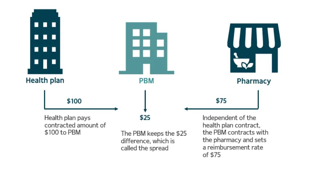 So let’s say the copay for a $100 drug at a retailer is $25. The retailer will ask the PBM for $75. The PBM then asks the health plan for $100 and pockets the $25 difference - this is commonly referred to as “spread pricing” and is a major source of revenue for PBMs.
