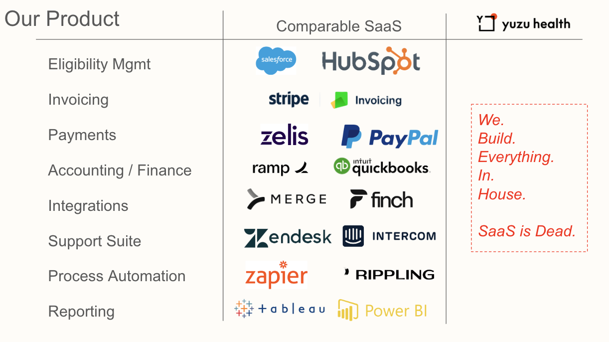 We have a top-tier engineering team and have built all internal and external software for our plans in-house. These are the products you would work on at Yuzu. SaaS is dead (this is the real impact from AI, not chatbots that tell you how to healthcare).