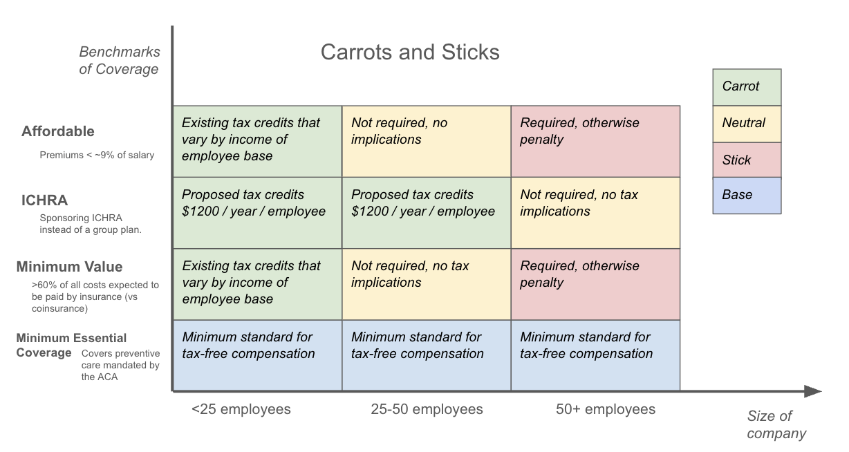 The above diagram is a map of the penalties and advantages available and proposed for employer health insurance.