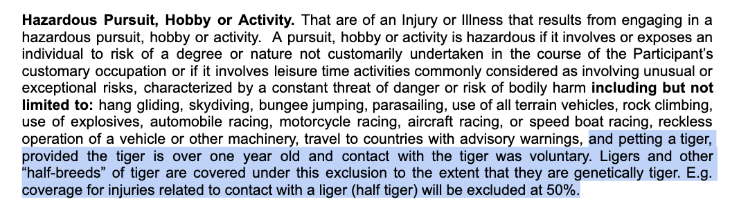 Another funny example of writing whatever you want in a plan document is as follows. A common plan document exclusion is for "hazardous activities". It's legal and common to exclude things like skydiving, shark breeding, whatever. I wrote in a custom exclusion for petting tigers (see below) into the Yuzu plan (for internal employees). This is perfectly legal.