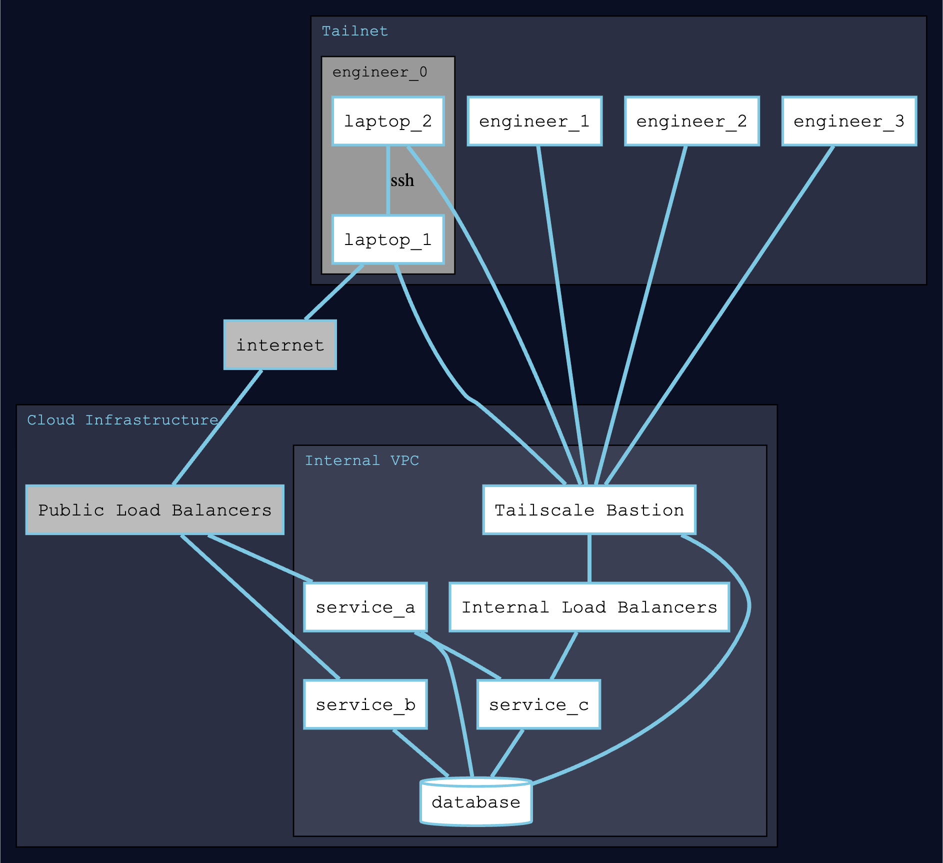 First we had to decide how we’d like to configure this. Obviously, when picking a tool like Tailscale we wanted to lean into it’s design philosophy. We see almost no latency, and all engineers keep the Tailscale client on practically 24/7, ensuring nearly no interruption with configuration, no adding SSH public keys to a central bastion, no >250ms latency when working remotely from the west coast.