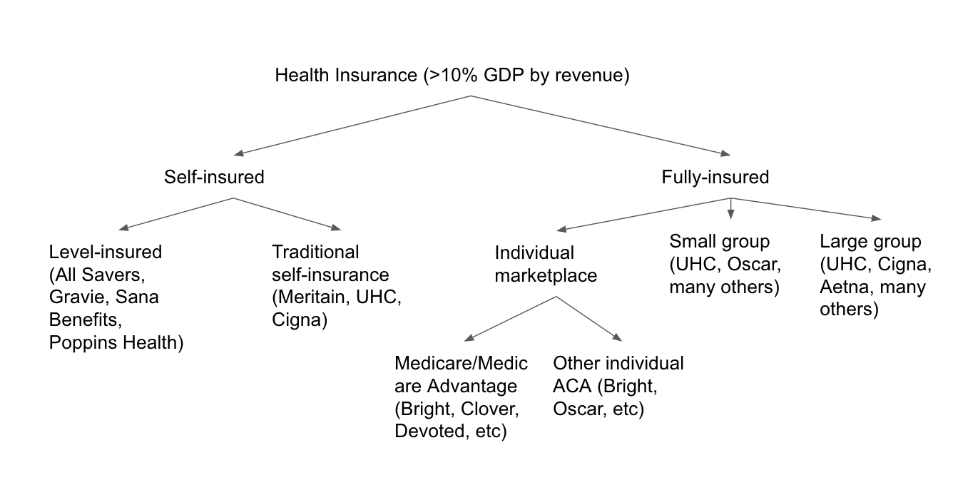 Fun fact: almost all large employers self-insure. Because of this, 64% of Americans with employer-sponsored insurance (non-Medicare, non individual-marketplace) are on a self-funded plan. src
